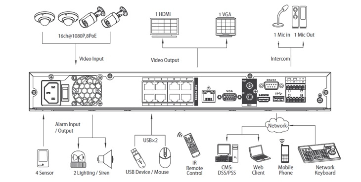 Wbudowane wyjścia HDMI (1080p), VGA orazBNC daje możliwość podłączenia urządzenia do dowolnego odbiornika. Rejestrator wyposażony również został w switch POE który umożliwia zasilanie kamer bez dodatkowych urządzeń, stosowania dodatkowego okablowania. Dzięki podwójnemu strumieniowi transmisja po sieci nie obciąża przesadnie łącza internetowego.
