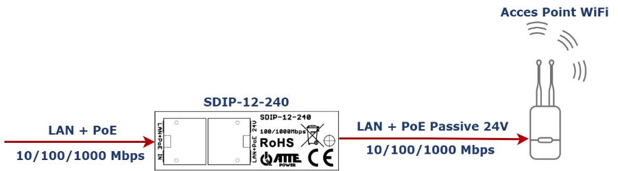 Adapter SDIP-12-240 stanowi nowoczesne rozwiązanie zasilające z linii ATTE. Urządzenie dedykowane jest do zasilania punktów dostępowych AP WiFi oraz innych odbiorników wymagających standardu PoE Passive 24V. Moduł umożliwia pobieranie energii z dowolnego switcha pracującego w standardzie PoE 802.3af. Jest to nowa wersja popularnego adaptera ASDC-12-240-HS. Pozwala ona na w pełni zamienne stosowanie w istniejących systemach bez konieczności modyfikacji infrastruktury kablowej.