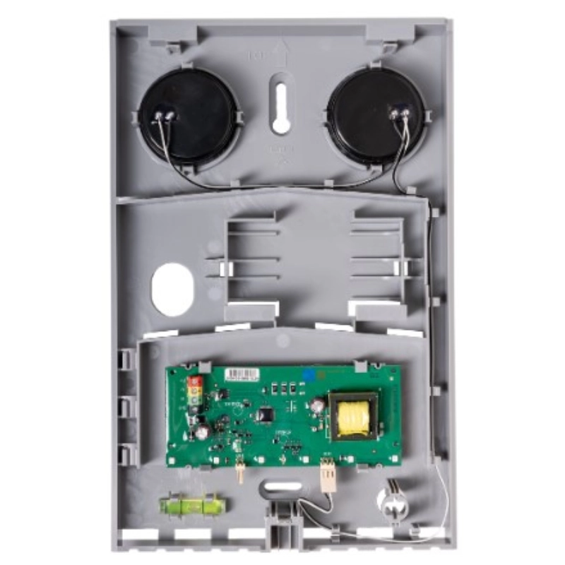 Podstawa charakteryzuje się dużą mocą dźwięku na poziomie 100 dB/m. Gwarantuje to skuteczne odstraszanie intruza oraz powiadomienie otoczenia o naruszeniu strefy. Urządzenie posiada dedykowane złącze dla opcjonalnego akumulatora zapasowego NiMH BAT-4V8-LH1800. Zastosowanie podtrzymania bateryjnego sprawia, że syrena pozostaje aktywna nawet po odcięciu głównego zasilania z magistrali. Inteligentny system monitoruje stan ogniwa i informuje o niskim napięciu poniżej progu 4,6 V.