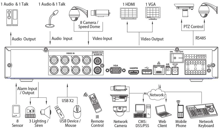 Rejestrator 4 kanałowy HD-CVI umożliwiający pracę w trybie trybrydy, w którym obsługuje zarówno kamery HD-CVI jak i kamery IP (max. 2). Posiada on wbudowane 2 porty USB, umożliwiające podłączenie myszy komputerowej, pamięci zewnętrznej, itp. Rejestrator ten ma także wbudowane wejścia/wyjścia alarmowe, które umożliwiają integrację z urządzeniami systemów alarmowych. Rejestrator został zbudowany w oparciu o wydajny procesor i system operacyjny Linux, który cechuje się bardzo wysoką funkcjonalnością i stabilnością.