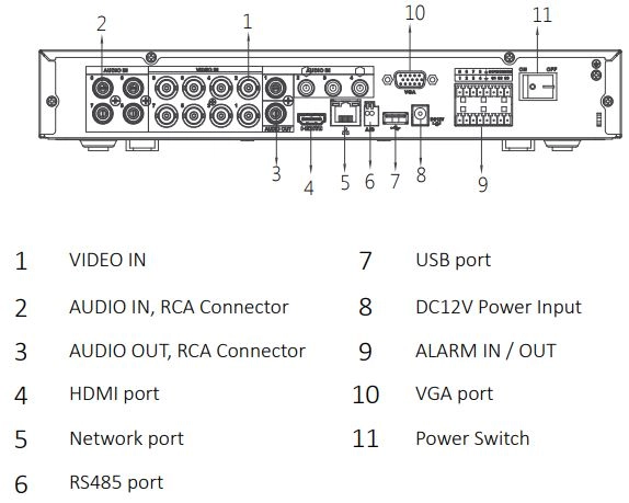 Wyposażony w wyjście wideo VGA/HDMI zapewniający obsługę zdalną oraz lokalną za pomocą myszki komputerowej i intuicyjnego układu menu. Posiada interfejs pomocniczy RS485 do kontroli PTZ. Dysponuje portem: 2x USB (2.0). Obsługuje połączenie P2P, które zapewnia zdalny dostęp i szybką konfiguracje niezależnie od posiadanego łącza internetowego.