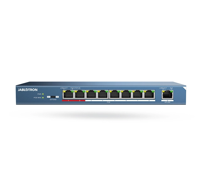 Przełącznik PoE jest odpowiedni do łatwego i szybkiego rozszerzenia lokalnej sieci LAN. Jest wyposażony w osiem portów PoE do transmisji danych oraz do zasilania kamer IP JABLOTRON za pomocą jednego kabla.