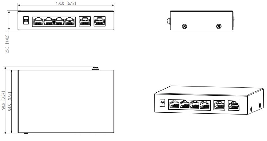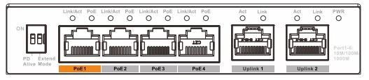 Posiada 4 porty PoE 10/100/1000Mbps oraz 2 porty Uplink 10/100/1000Mbps. Obsługuje Hi-PoE 60W (port pomarańczowy). Oprócz standardów IEEE802.3af i IEEE802.3at, pomarańczowy port obsługuje również maksymalną moc wyjściową 60W do zasilania urządzeń o dużej mocy.