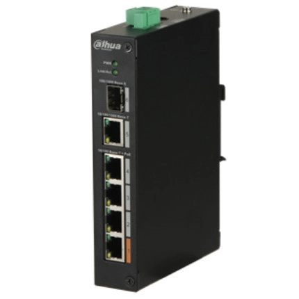 posiada 6 portów: 1 x port SFP 100/1000 Base-X, 1 x RJ45 10/100/1000 Base-T, 4 x RJ45 10/100 Base-T (PoE). Urządzenie zapewnia płynną transmisję sieciową z prędkością 10/100/1000 Mbps. Urządzenie posiada samoadaptacyjny port światłowodowy SFP o prędkości 100/1000Mb/s.