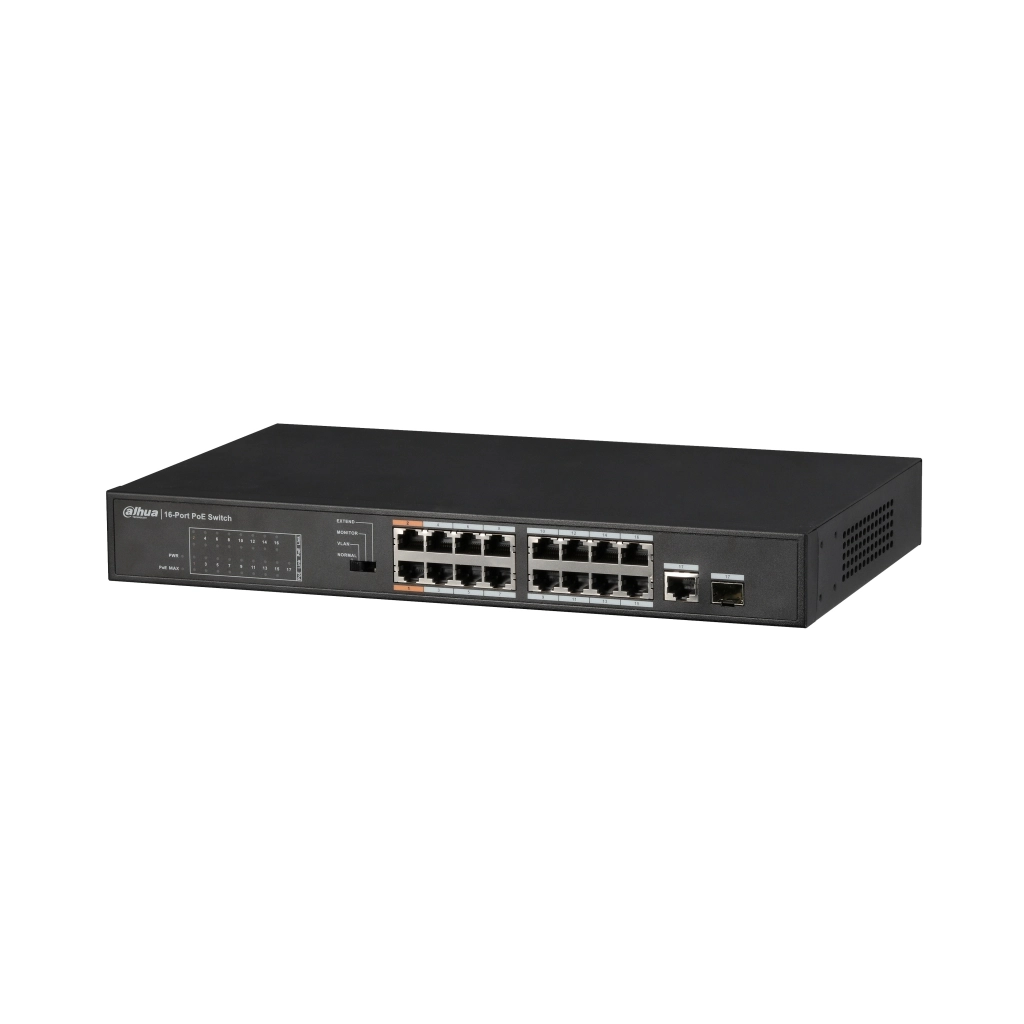 Przełącznik PoE+ model PFS3117-16ET-135 firmy Dahua. Posiada 16 portów zapewniających płynną transmisję sieciową z prędkością 10/100Mbps oraz jeden gigabit combo port(RJ45/SFP).