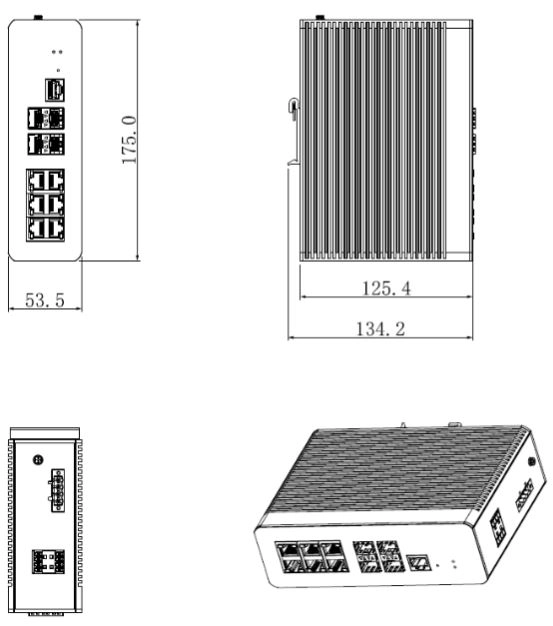 Port 1 i 2 (pomarańczowy port) obsługują technologię Hi-PoE, która zapewnia maksymalnie 60 W przez pojedynczy port. Przemysłowy przełącznik PoE zarządzany przez warstwę 2 obsługuje sieć, SNMP, a także CLI. Obsługuje redundancję sieci pierścieniowej przy użyciu standardowego protokołu STP / RSTP / MSTP, a także obsługuje bogate funkcje, takie jak VLAN, agregacja łączy, dublowanie portów, kontrola przepływu, IGMP Snooping, SNMP, ROMN, ACL, QoS, statyczny routing IP itp. Ma stopień ochrony IP40 i możliwość montażu na szynie DIN.