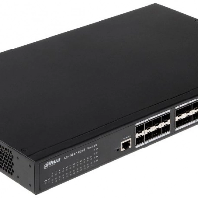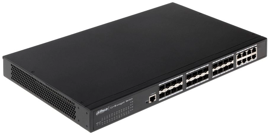 Switch zarządzalny PFS5424-24T firmy Dahua. Posiada 24 porty. Dwuwarstwowy zarządzalny przełącznik. Urządzenie zapewniające płynną transmisję sieciową z prędkością 10/100/1000 Mbps. Switch posiada 16 portów 1000M SFP oraz 8 portów Combo 1000BASE-T/SFP. Urządzenie zarządzalne posiada swój interfejs sieciowy z poziomu którego użytkownik ma możliwość pełnej konfiguracji poszczególnych portów switcha. Urządzenie posiada także porty na wkładkę SFP - możliwość urządzenia z resztą sieci za pomocą światłowodu. Switch posiada wiele funkcji takich jak trasa, dublowanie portów, izolacja portów, powiązanie ARP, drzewo opinające, VLAN, ACL, DHCP snooping, multicast, agregacja łączy itp.