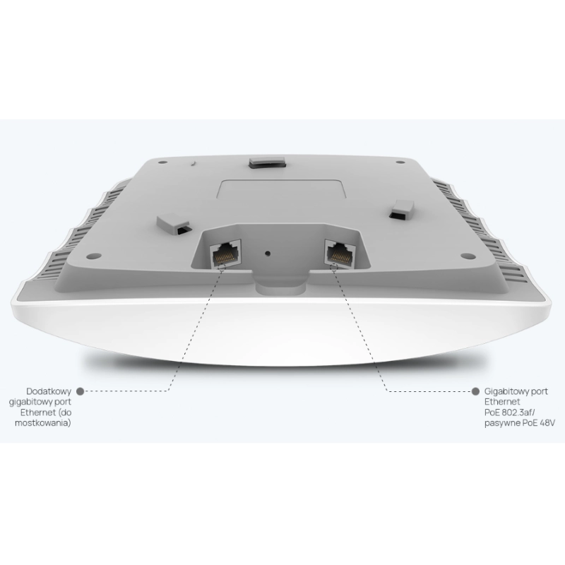 Kluczowe innowacje sieciowe obejmują zaawansowaną technologię Mesh, która umożliwia AP-kom komunikację bezprzewodową, znacząco upraszczając skalowanie i rozmieszczenie sieci bez użycia okablowania. Ponadto, funkcja Seamless Roaming zapewnia, że użytkownicy utrzymują nieprzerwane połączenia głosowe i strumienie wideo podczas przemieszczania się między strefami zasięgu. Zasilanie urządzenia jest elastyczne: obsługuje zarówno standardowe PoE 802.3af/at, jak i pasywne PoE. Cała infrastruktura może być centralnie zarządzana za pomocą platformy Omada SDN, oferując pełną kontrolę z poziomu chmury.