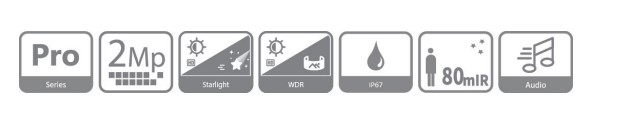 Wyposażona jest w przetwornik o rozdzielczości 2Mpx, która zapewnia obraz w dobrej jakości z wiernie oddanymi kolorami i małymi szumami przy braku oświetlenia. Urządzenie posiada obiektyw 3.6 mm dając szeroki kąt widzenia kamery uskuteczniając zakres nadzoru. Jest to kamera przeznaczona do pracy na zewnątrz budynku. W urządzeniu zastosowano technologie 3D Noise Reduction, która zmniejsza szumy przy słabym oświetleniu, funkcje BLC, zaś AWB bieli.