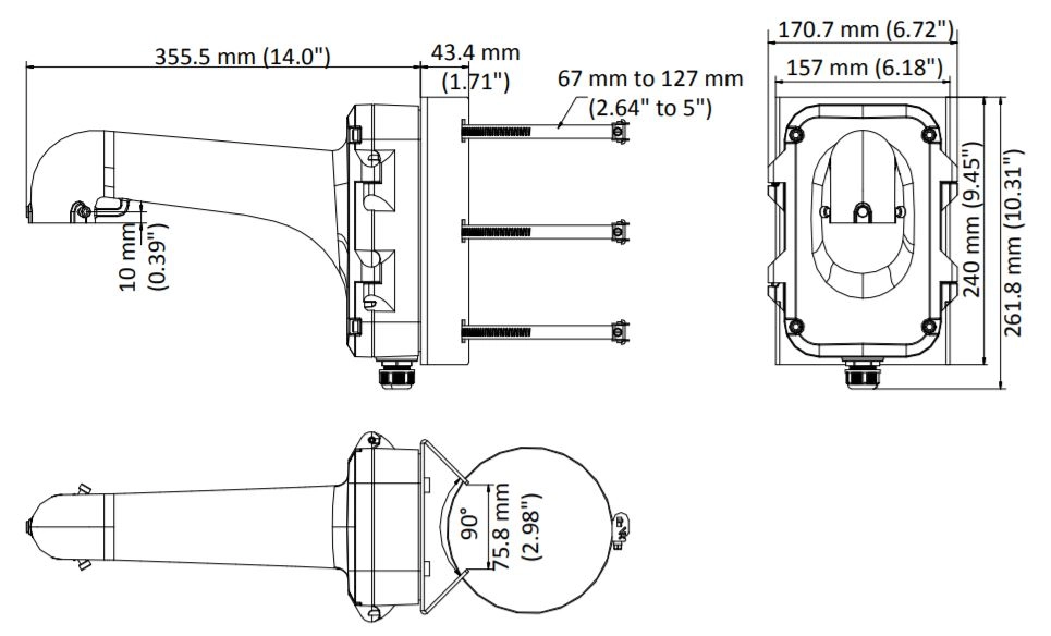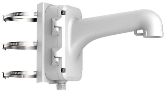 Wspornik do montażu na słupie ze skrzynką przyłączeniową. Uchwyt wykonany ze stopu aluminium i stali z natryskiwaniem powierzchniowym. Skrzynka połączeniowa posiada dolny wylot i tylny wylot, dając możliwość poprowadzenia okablowania. Uchwyt wyposażony jest w hak do liny zabezpieczającej, który ułatwia instalację szybkiej kopuły. Regulowana średnica od 67 mm do 127 mm.
