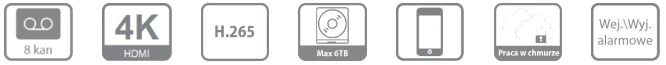 - Wyświetlanie i nagrywanie do 8 kamer IP w rozdzielczości maksymalnej 8Mpx, maks. przepustowość 64Mbps,